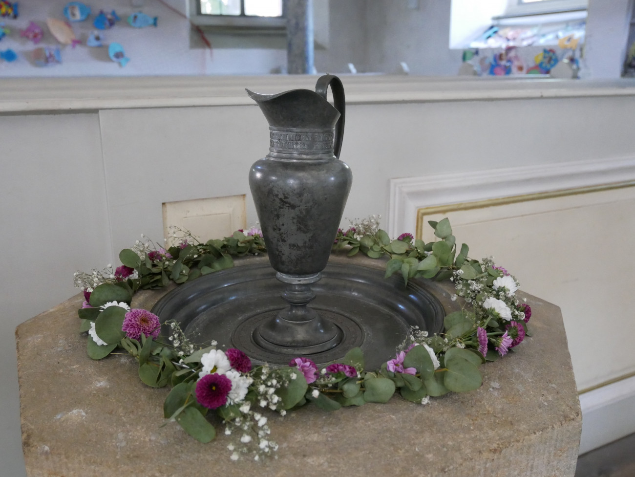 Der heutige Taufstein stammt aus dem Jahr 1924, geschaffen vom Beiersdorfer Bildhauer Gustav Schmidt.